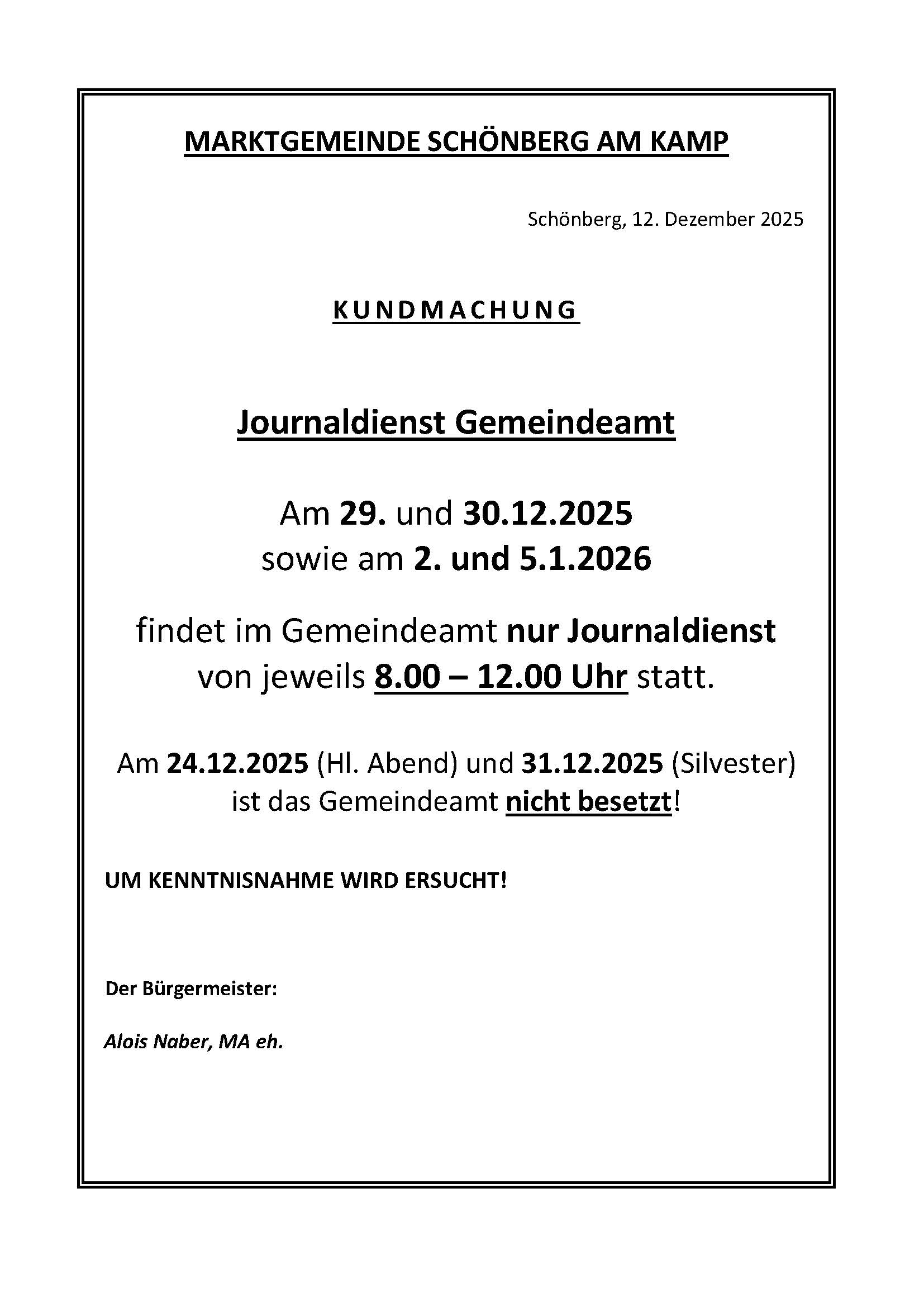 JOURNALDIENST WEIHNACHTEN AM GEMEINDEAMT SCHÖNBERG