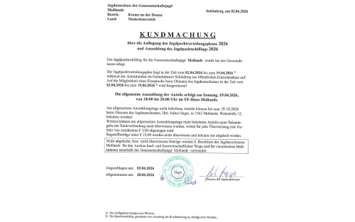 Genossenschaftsjagd Mollands: Auflegung des Jagdpachtverteilungsplanes 2026 und Auszahlung des Jagdpachtschillings 2026